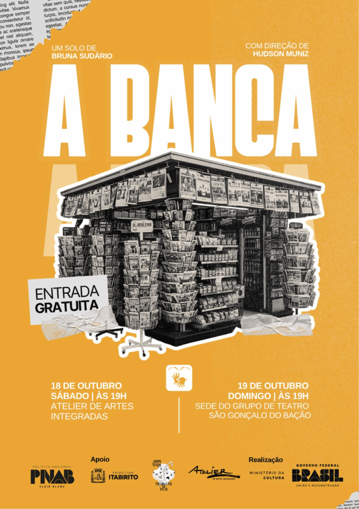 Em formato de monólogo, “A Banca” apresenta diferentes personagens interpretados por Bruna Sudário, que, ao lado de Hudson, iniciou sua trajetória artística no próprio Atelier de Artes Integradas, ainda nos primeiros anos de funcionamento do espaço.