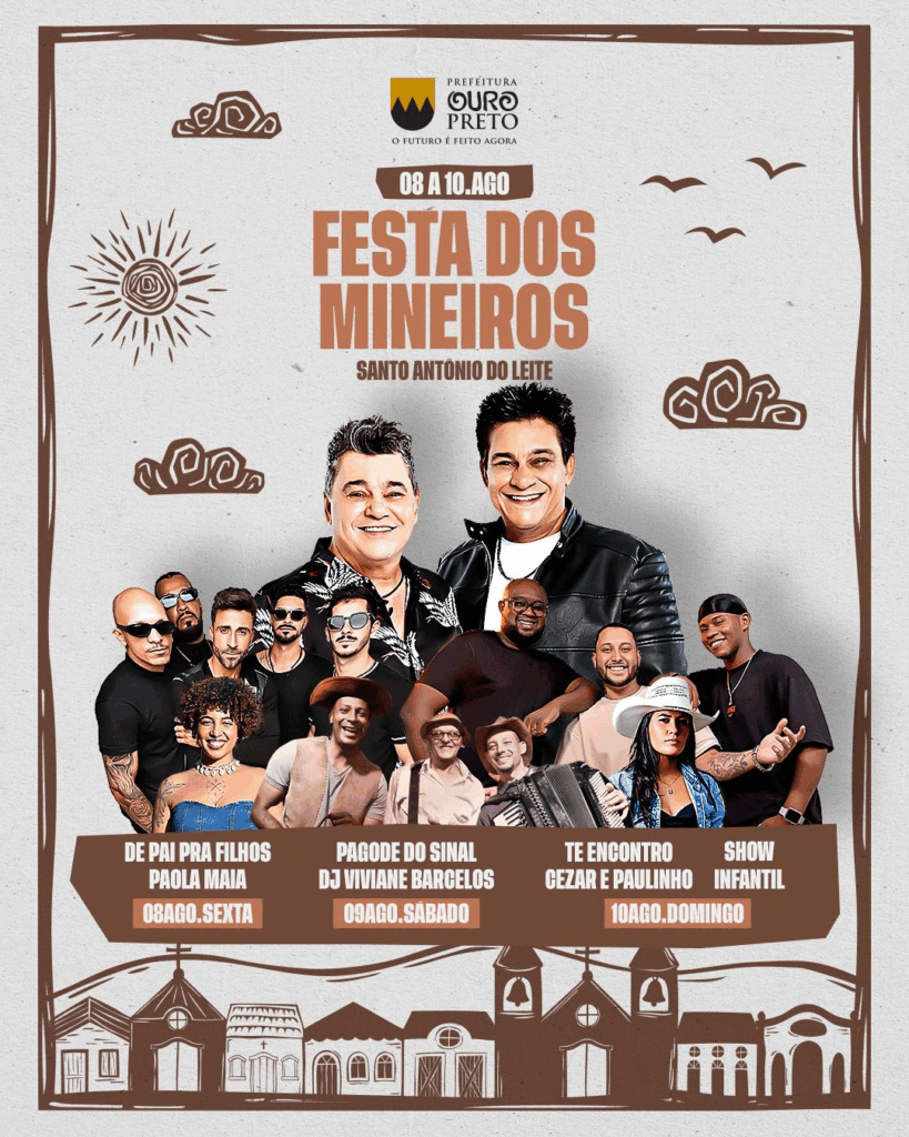 Santo Antônio do Leite, distrito de Ouro Preto (MG), recebe, entre os dias 8/8 e 10/8, mais uma edição da tradicional Festa dos Mineiros. A dupla Cezar e Paulinho é a atração do último.