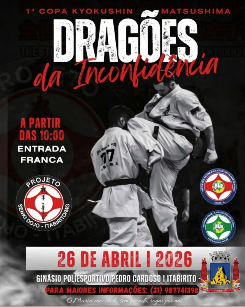 ITABIRITO (MG) – No dia 26/4, a partir das 10h, o Poliesportivo Pedro Cardoso será o palco da 1ª Copa de Karatê Kyokushin Matsushima – Dragões da Inconfidência.