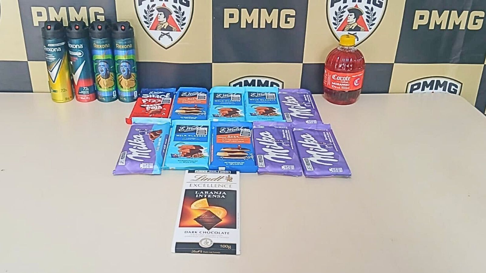 ITABIRITO (MG) — Produtos de furto variados: 11 barras de chocolate europeu, incluindo os suíços Lindt e Milka, além do polonês E. Wedel. Mas, como ninguém é chique 24 horas por dia, o autor também resolveu levar uma garrafinha de Corote sabor morango. Para completar o kit, ainda selecionou cinco frascos de desodorante Rexona.