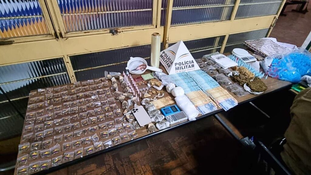 Em grande quantidade: cocaína, pasta base, crack, maconha e produtos para embalar os entorpecentes, entre outros materiais do tráfico, inclusive dinheiro (várias notas), foram apreendidos pela Polícia Militar (PM) na tarde deste sábado (29/11), no bairro Santa Rita, em Itabirito (MG).