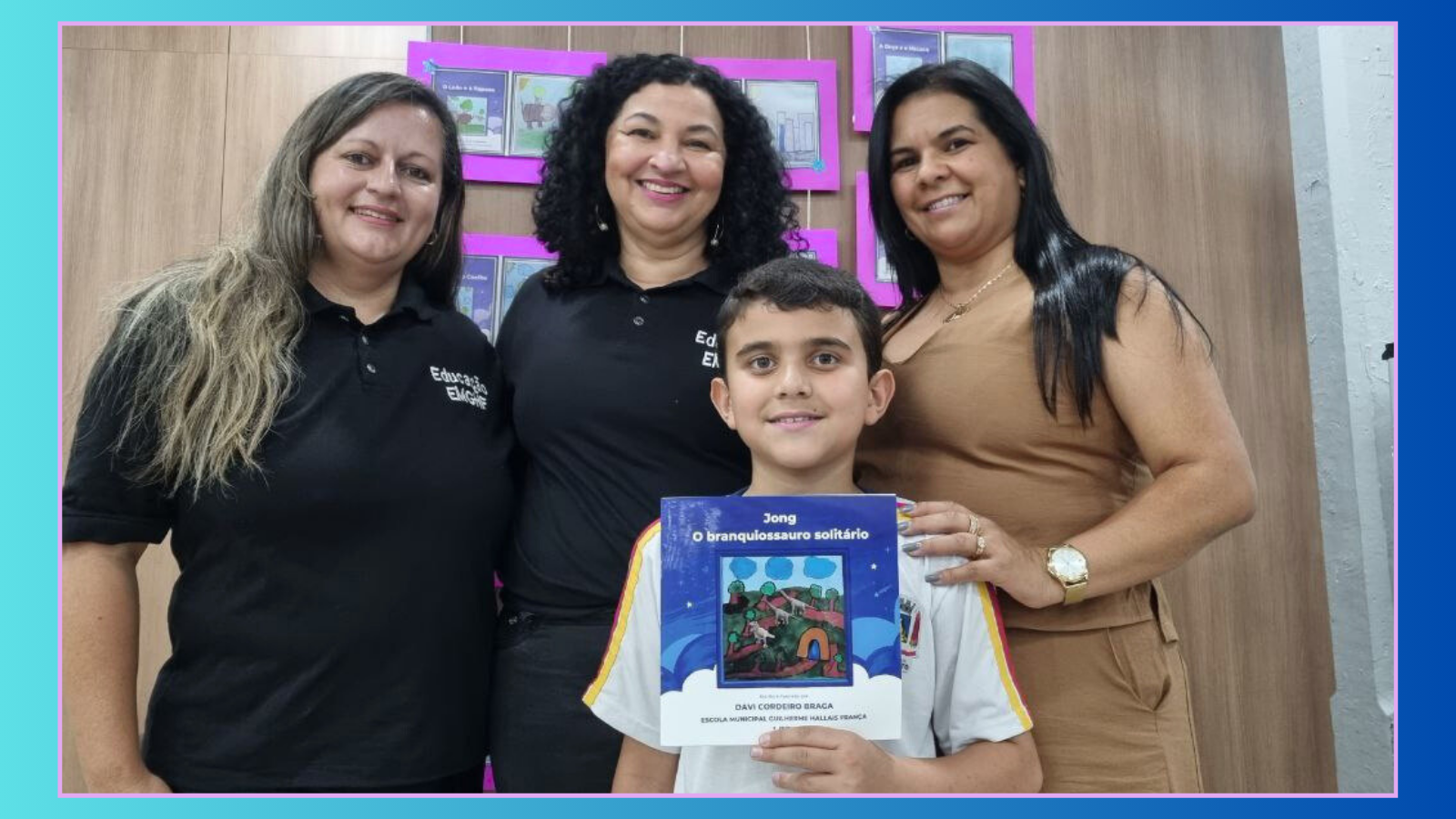 Professora Cristiane, diretora Teresinha, mãe Cíntia e o jovem autor Davi segurando sua obra - Foto: Radar Geral