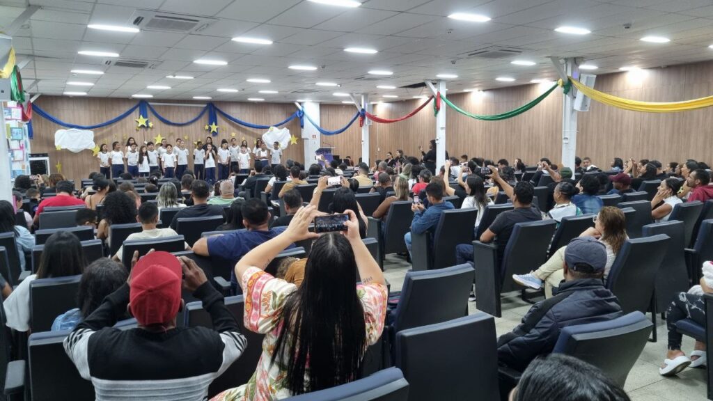 A Feira Literária de hoje aconteceu no auditório do Centro Administrativo da Prefeitura, reunindo alunos, pais, professores etc.