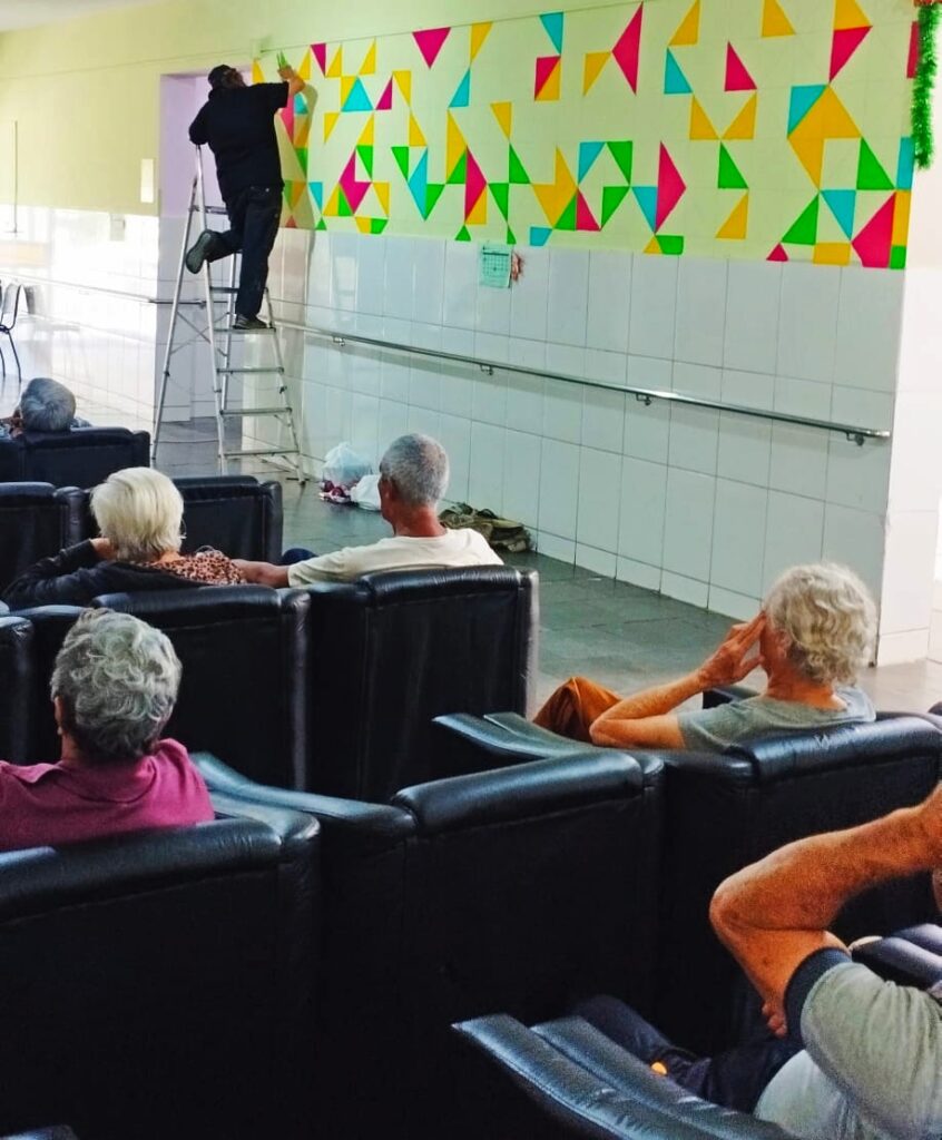 Ela pintou, ontem (11/12), um painel multicolorido na parede da sala de TV da Casa de Repouso Santa Luiza de Marilac, lar de idosos de Itabirito (MG).
