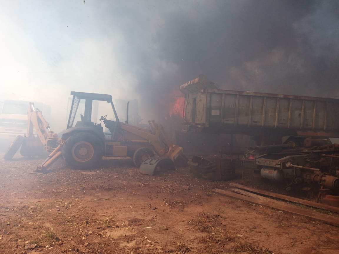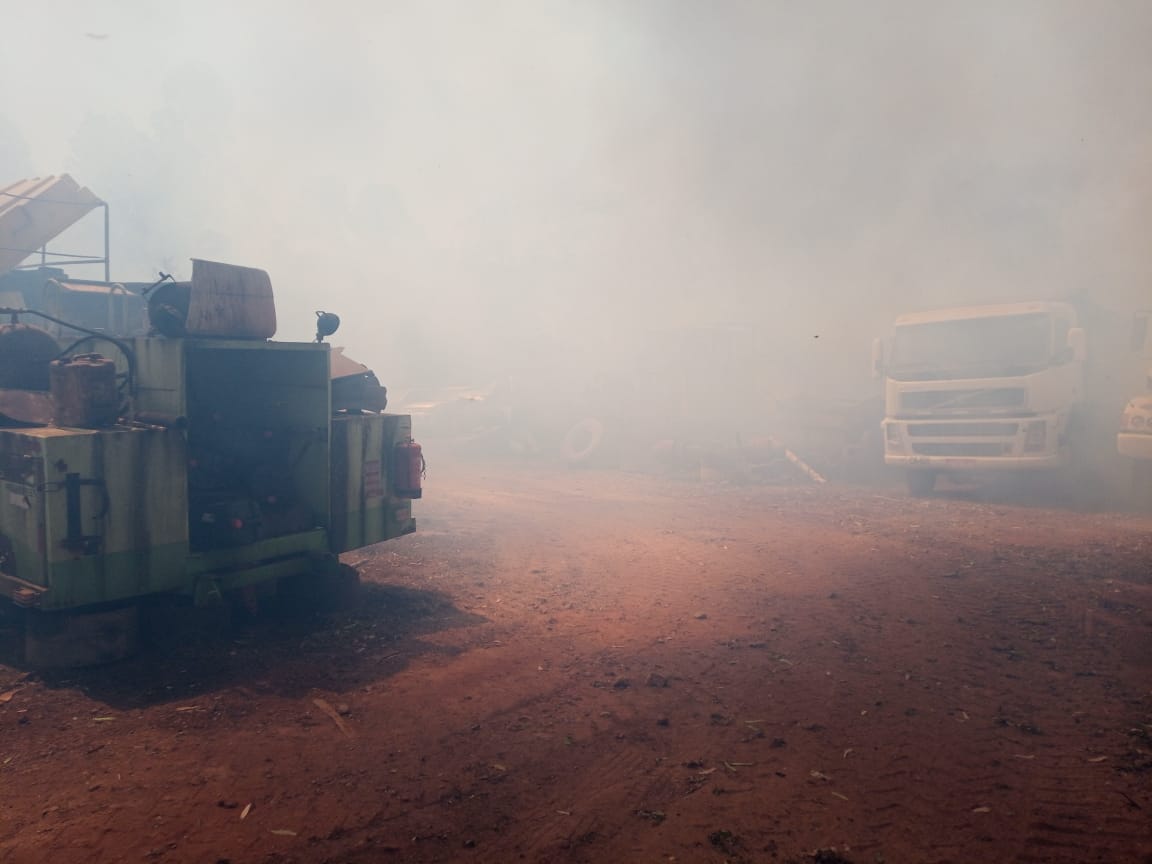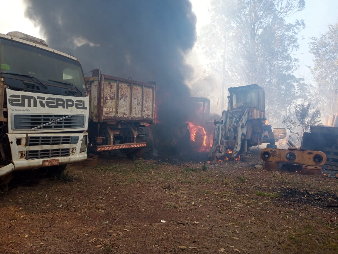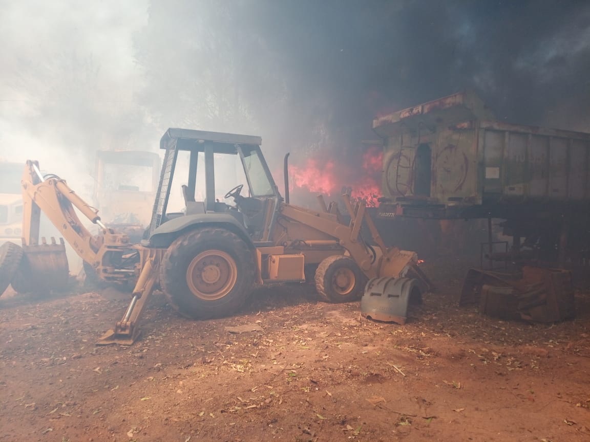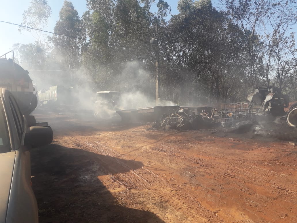 O incêndio danificou caminhões, tratores e carros da empresa. Aparentemente, parte (pelos menos) do maquinário não estava em uso.