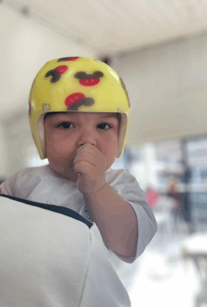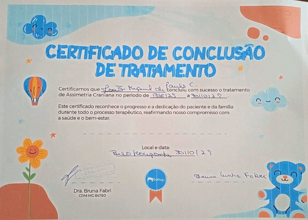 O menino realizava o tratamento de assimetria craniana desde 13/6 e, após meses de dedicação, recebeu um certificado em reconhecimento ao progresso alcançado e ao empenho da família durante todo o processo terapêutico.