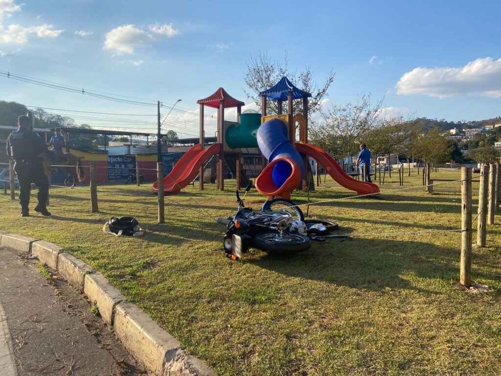 Obviamente sem habilitação, o menor desobedeceu a ordem de parada, colidiu com um ônibus escolar ao tentar ultrapassá-lo pela esquerda e, em seguida, invadiu o canteiro central, derrubando a cerca de um parque frequentado por crianças.