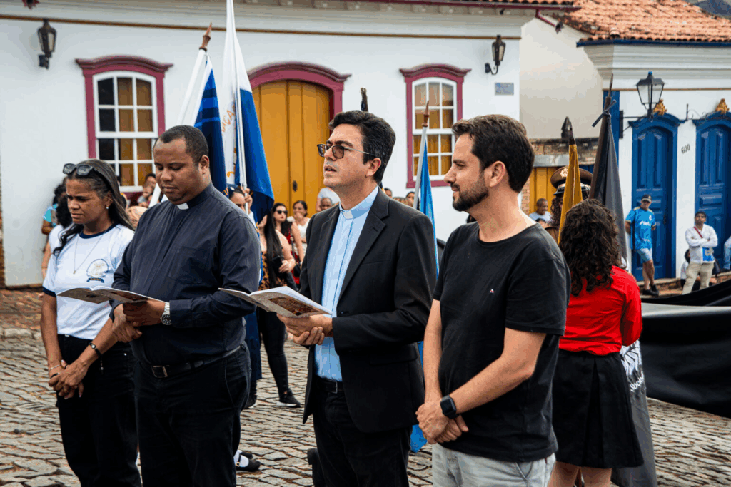 Sob um céu parcialmente encoberto, o rito teve início com orações conduzidas pelo reitor da Catedral, padre Geraldo Dias Buziani, e pelo chanceler do Arcebispado, padre Fabiano Alves de Assis. Pela primeira vez, todas as bandas da cidade se uniram para executar toques festivos ao longo do trajeto, conduzido pelos maestros que seguiram a Cruz — símbolo do Jubileu da Esperança — levada por padre Geraldo.