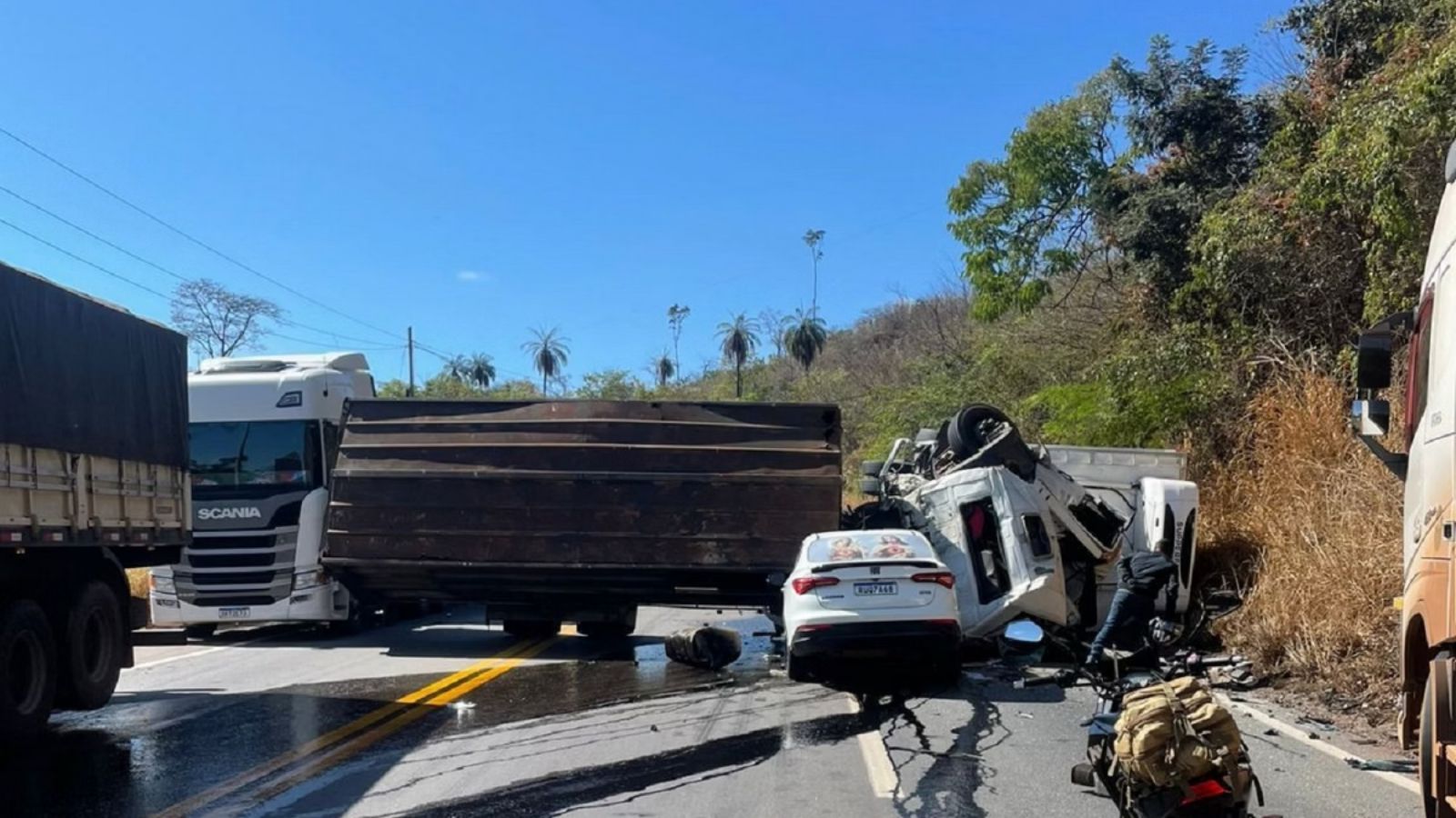 O Corpo de Bombeiros informou que a colisão ocorreu por volta das 8h45, em um trecho conhecido como Posto 30. As vítimas mortas são os condutores dos caminhões — um deles transportava carga frigorífica e o outro levava material reciclável.
