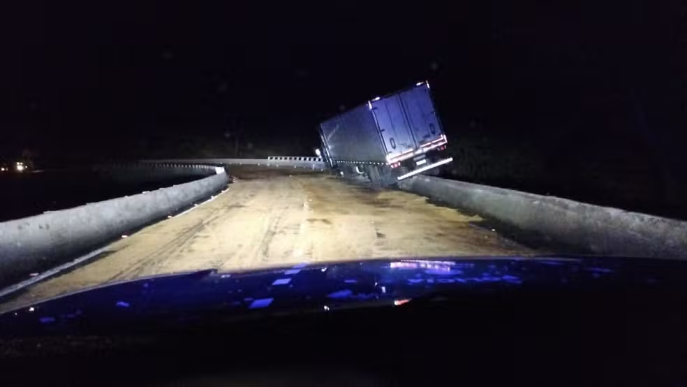 Uma carreta ficou presa ao guarda-corpo de um viaduto, no trecho conhecido como Ponte Branca, na BR-365, em Montes Claros (Norte de Minas). A informação é do G1.