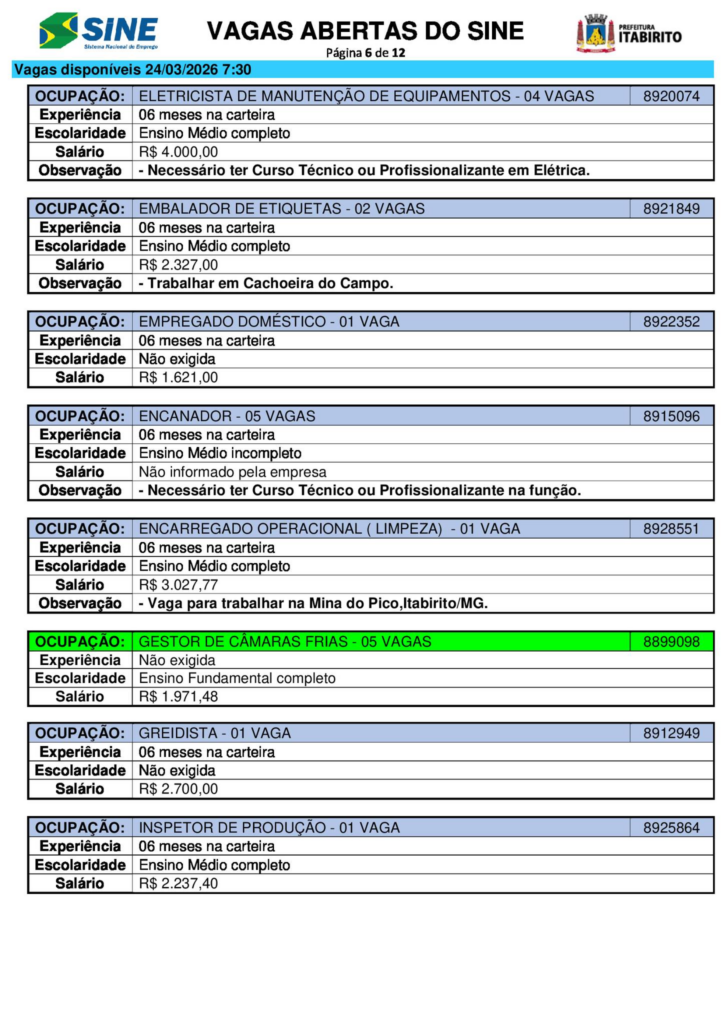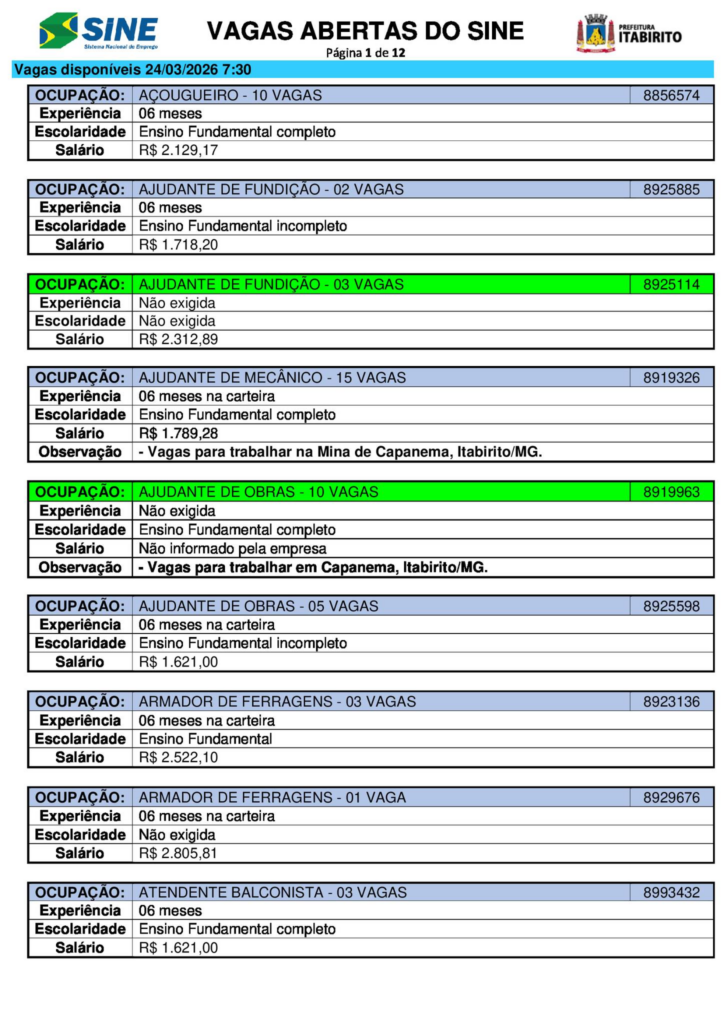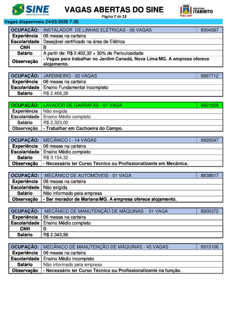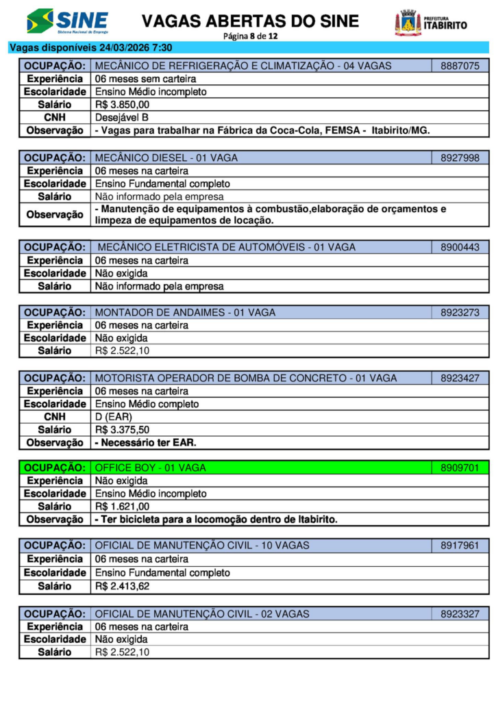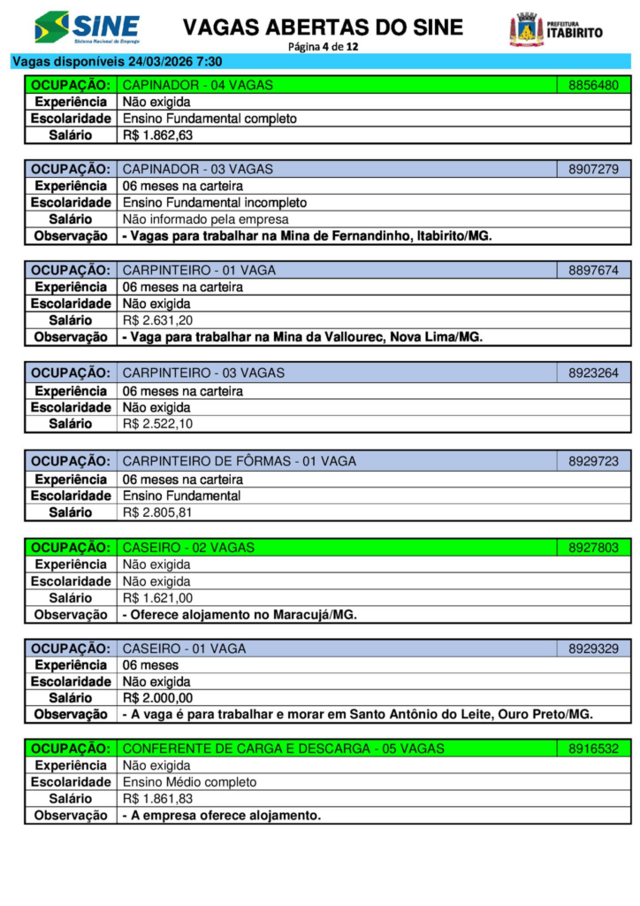 Os detalhes sobre cada oportunidade são repassados exclusivamente de forma presencial, na unidade do Sine Itabirito, localizada na Praça Dr. Guilherme, no Centro.