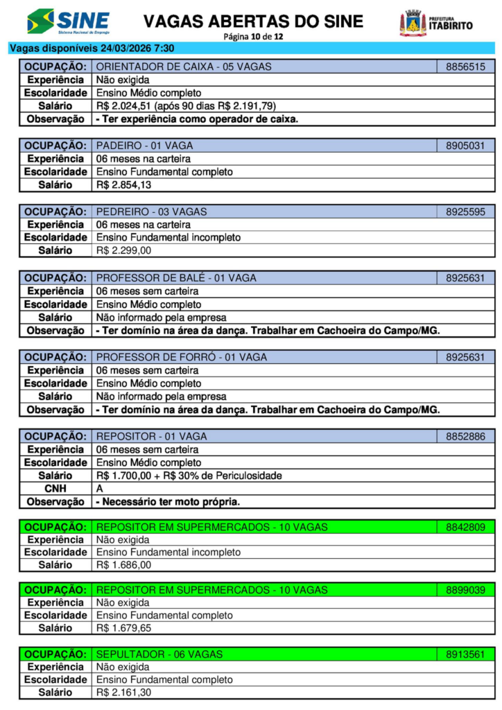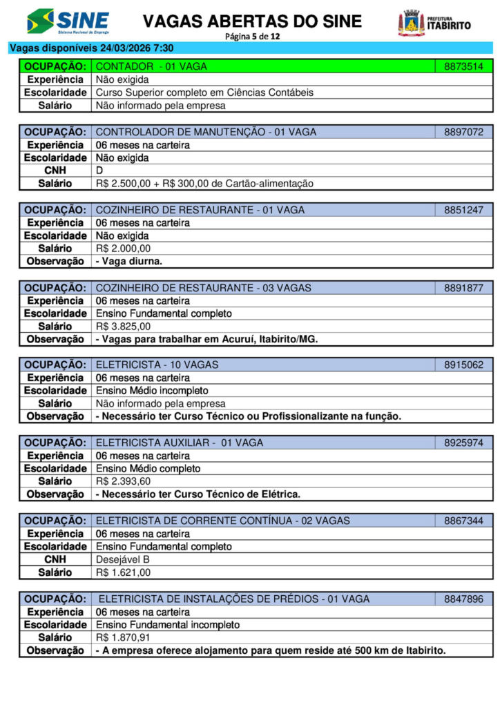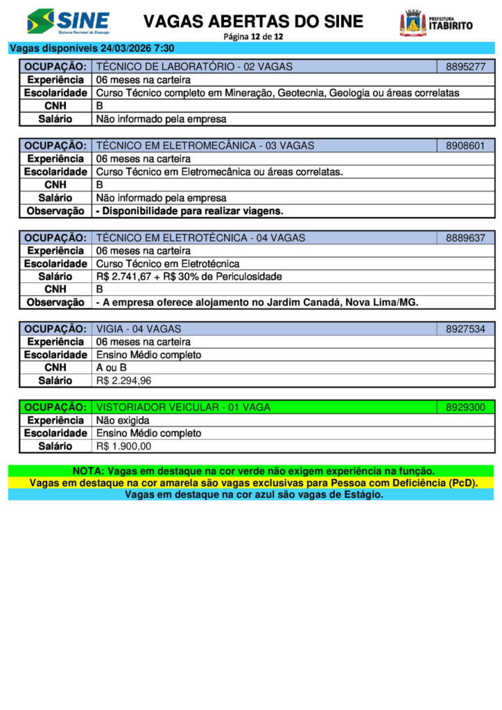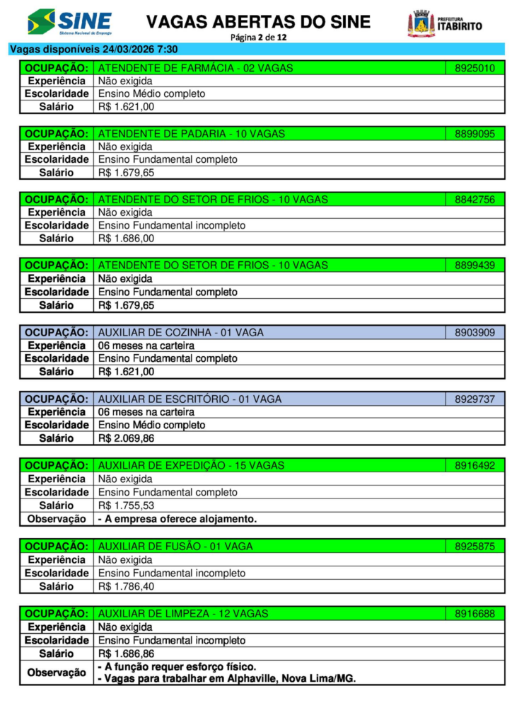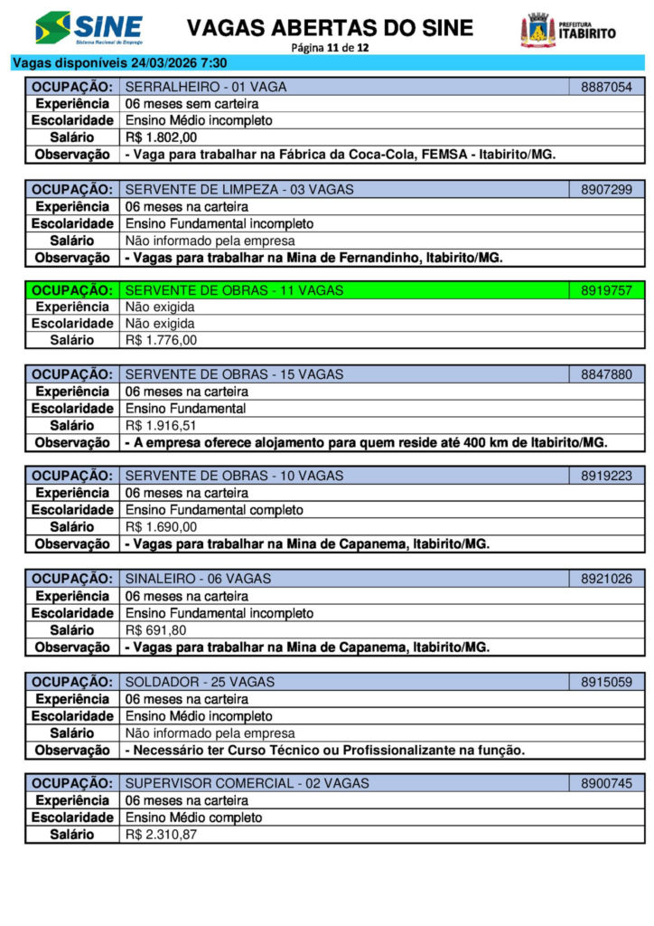 Os detalhes sobre cada oportunidade são repassados exclusivamente de forma presencial, na unidade do Sine Itabirito, localizada na Praça Dr. Guilherme, no Centro.