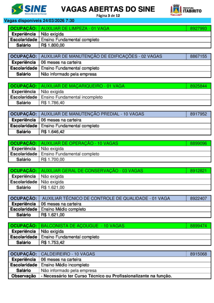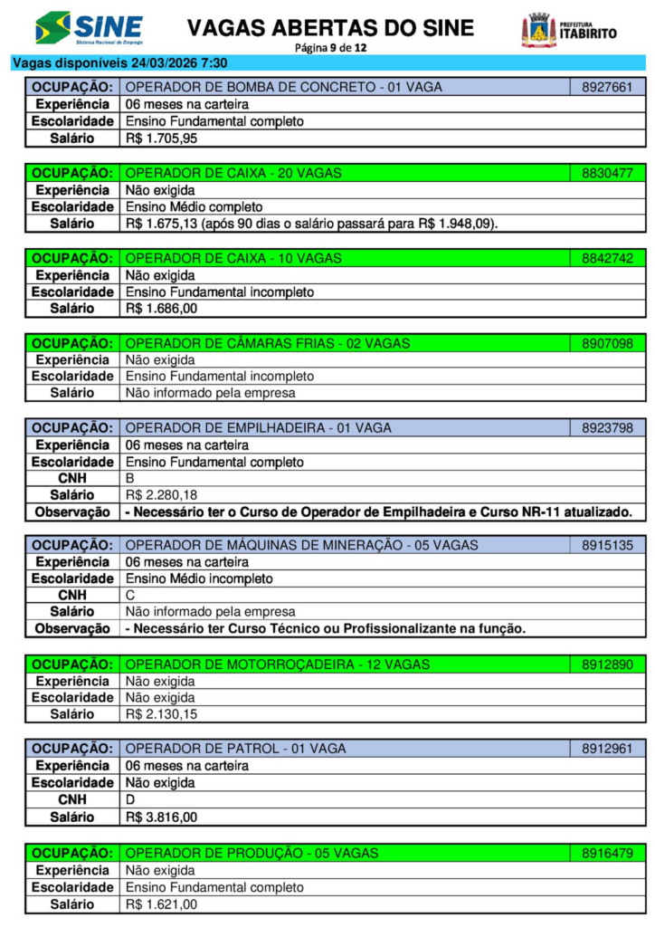 Segundo o Sine, as vagas podem ser preenchidas ou encerradas a qualquer momento, seja pelo atingimento do limite de encaminhamentos ou por decisão das empresas contratantes.