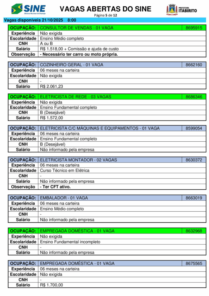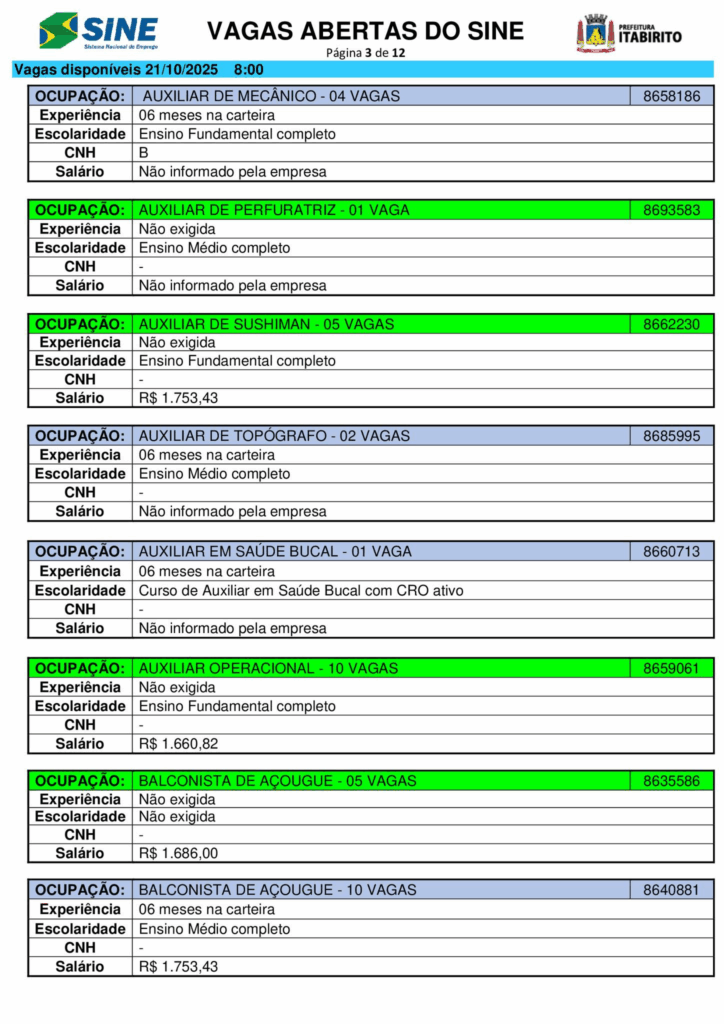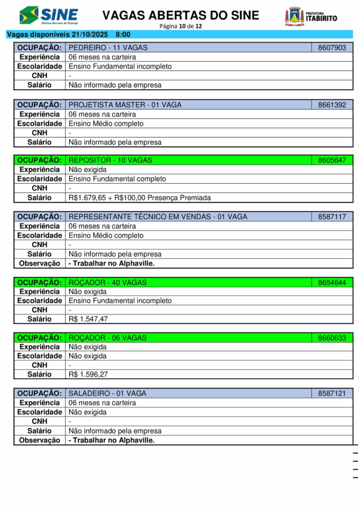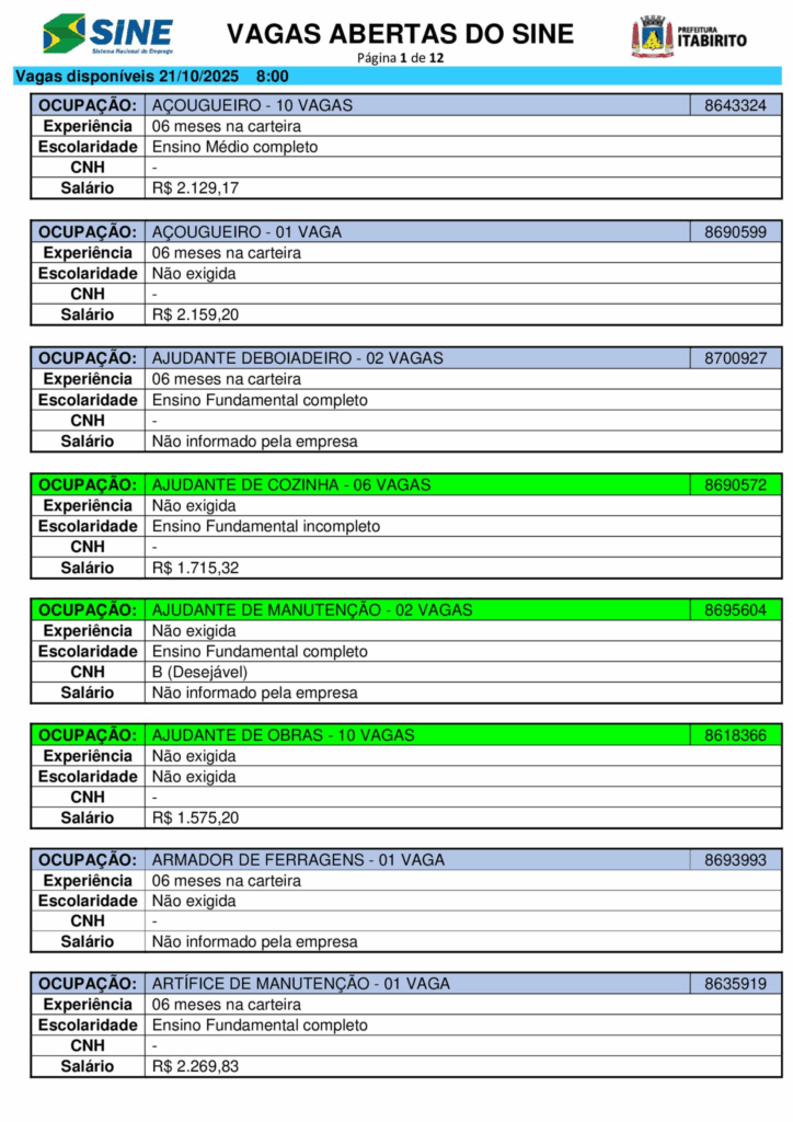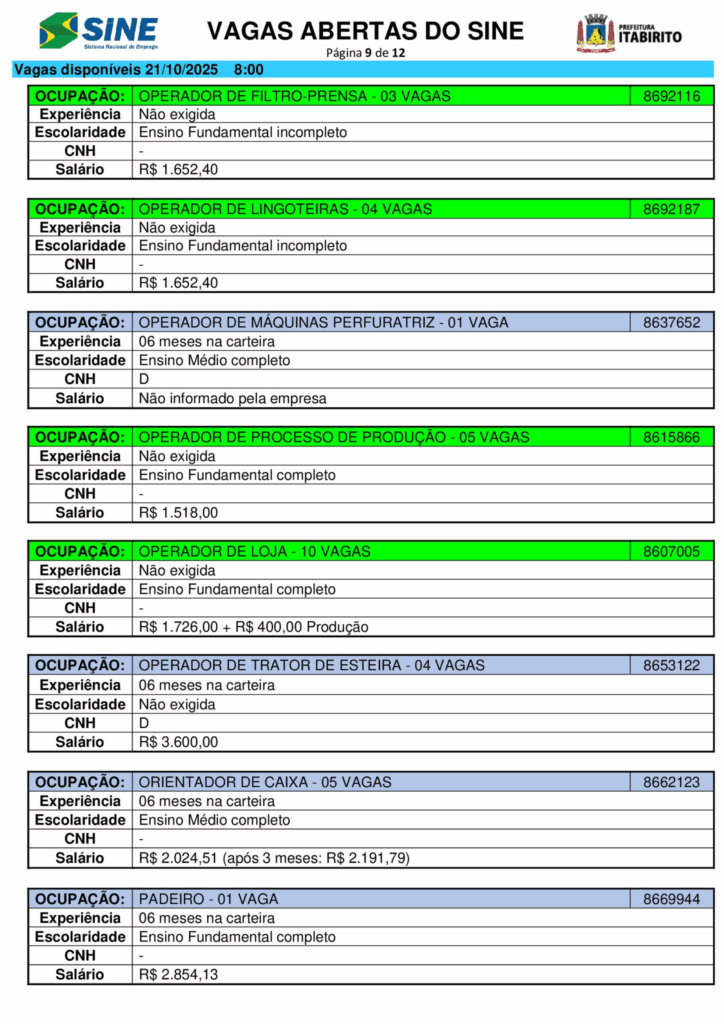 Nesta terça (21/10), o Sistema Nacional de Emprego (Sine) de Itabirito (MG) anunciou a abertura de 661 vagas de trabalho em diferentes setores.