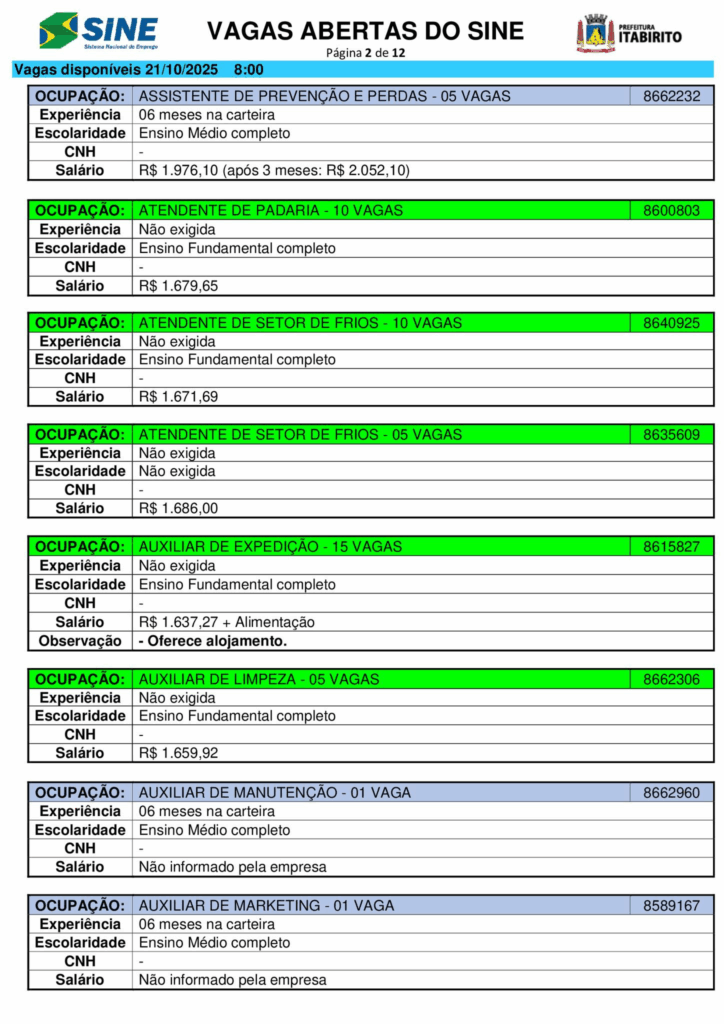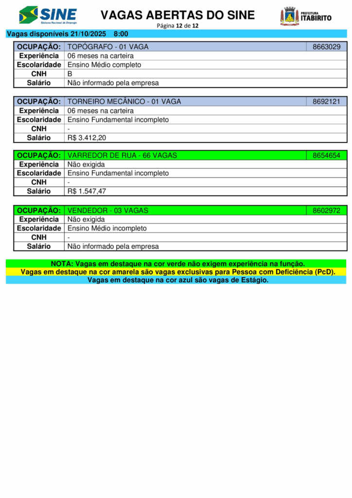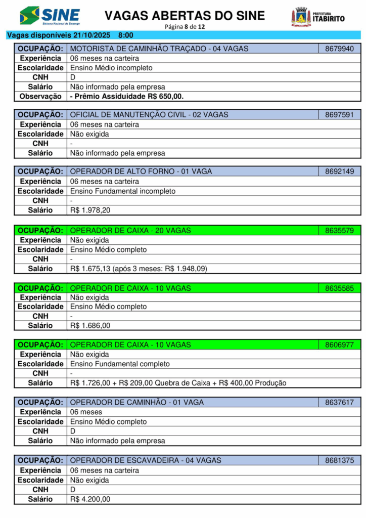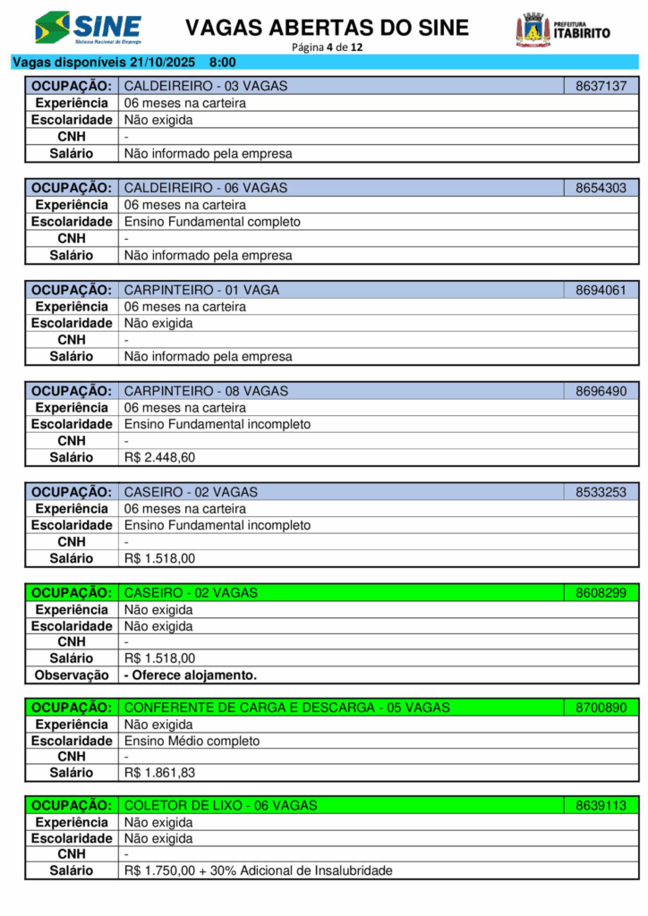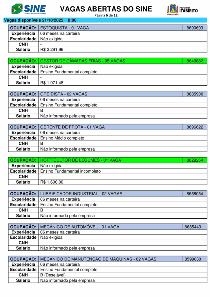 Nesta terça (21/10), o Sistema Nacional de Emprego (Sine) de Itabirito (MG) anunciou a abertura de 661 vagas de trabalho em diferentes setores.