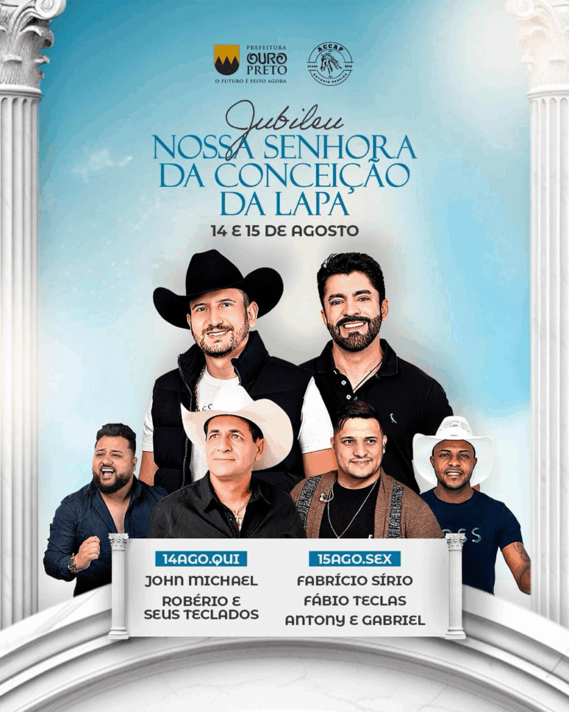 Antony e Gabriel (em 15/8), Robério e Seus Teclados (em 14/8) e Fabrício Sírio (também em 15/8) estão entre as atrações que se apresentação no distrito de Antônio Pereira, em Ouro Preto, na Festa da Lapa.
