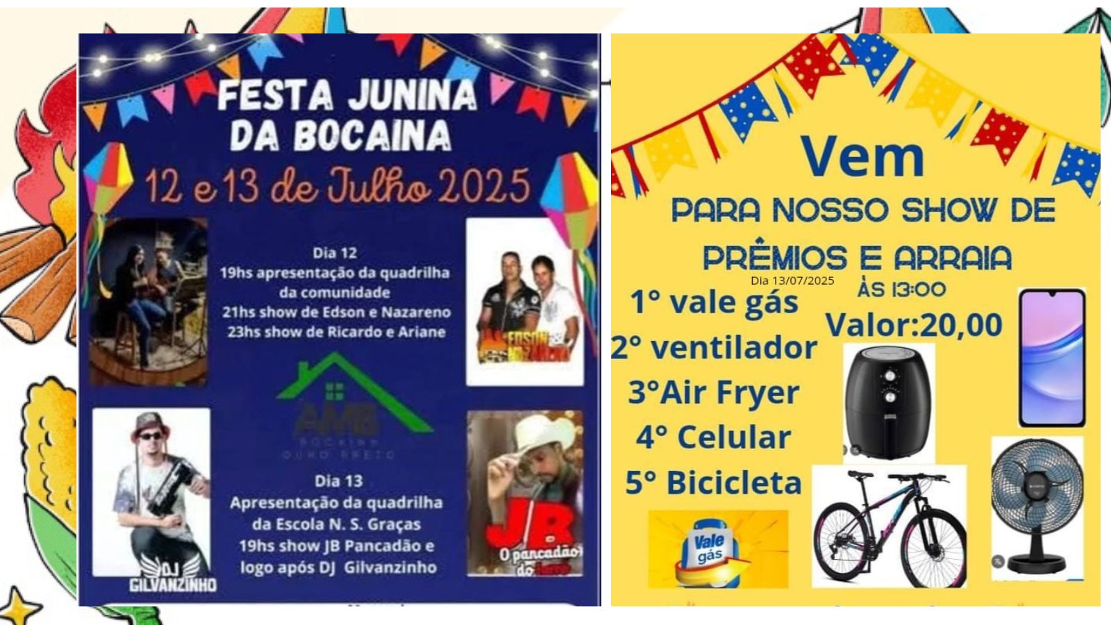 – 13h: Show de Prêmios e “Arraiá” (prêmios: vale gás, ventilador, air fryer, celular e bicicleta).