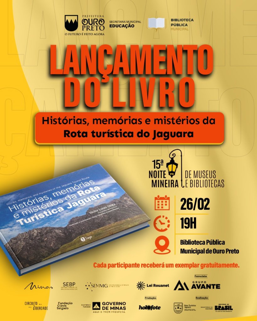 Em Ouro Preto, a Biblioteca Pública Municipal será palco do lançamento do livro “Histórias, Memórias e Mistérios da Rota Turística Jaguara”, às 19h.
