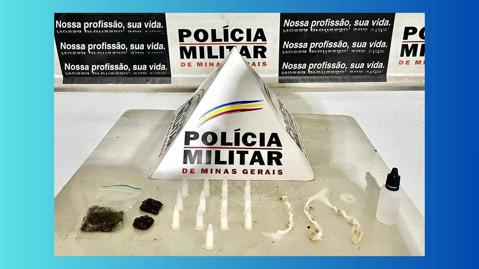 Os policiais informaram que o adolescente foi abordado e, com ele, os militares localizaram uma sacola na região da cintura, onde foram encontrados 13 pinos de cocaína, três porções de maconha, 12 pedras de crack, um frasco de lança-perfume e um aparelho celular.