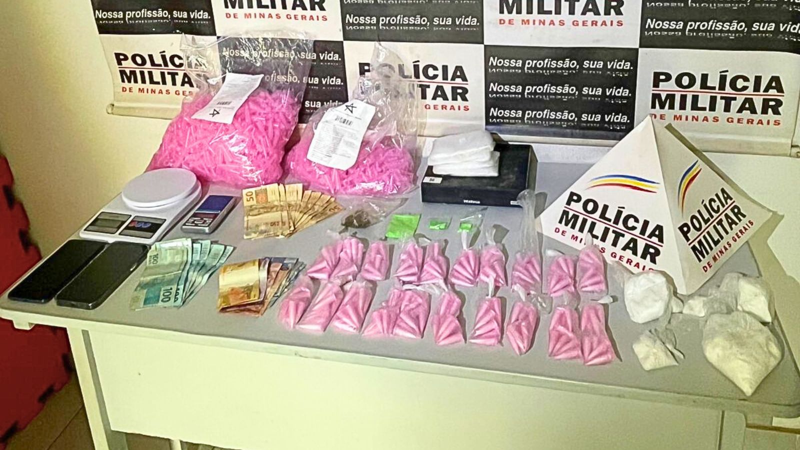 DROGAS SINTÉTICAS e COCAÍNA: foram encontrados 198 pinos de cocaína e 5 papelotes da mesma substância em um quarto externo. Sobre a geladeira, os militares apreenderam 8 comprimidos de ecstasy.