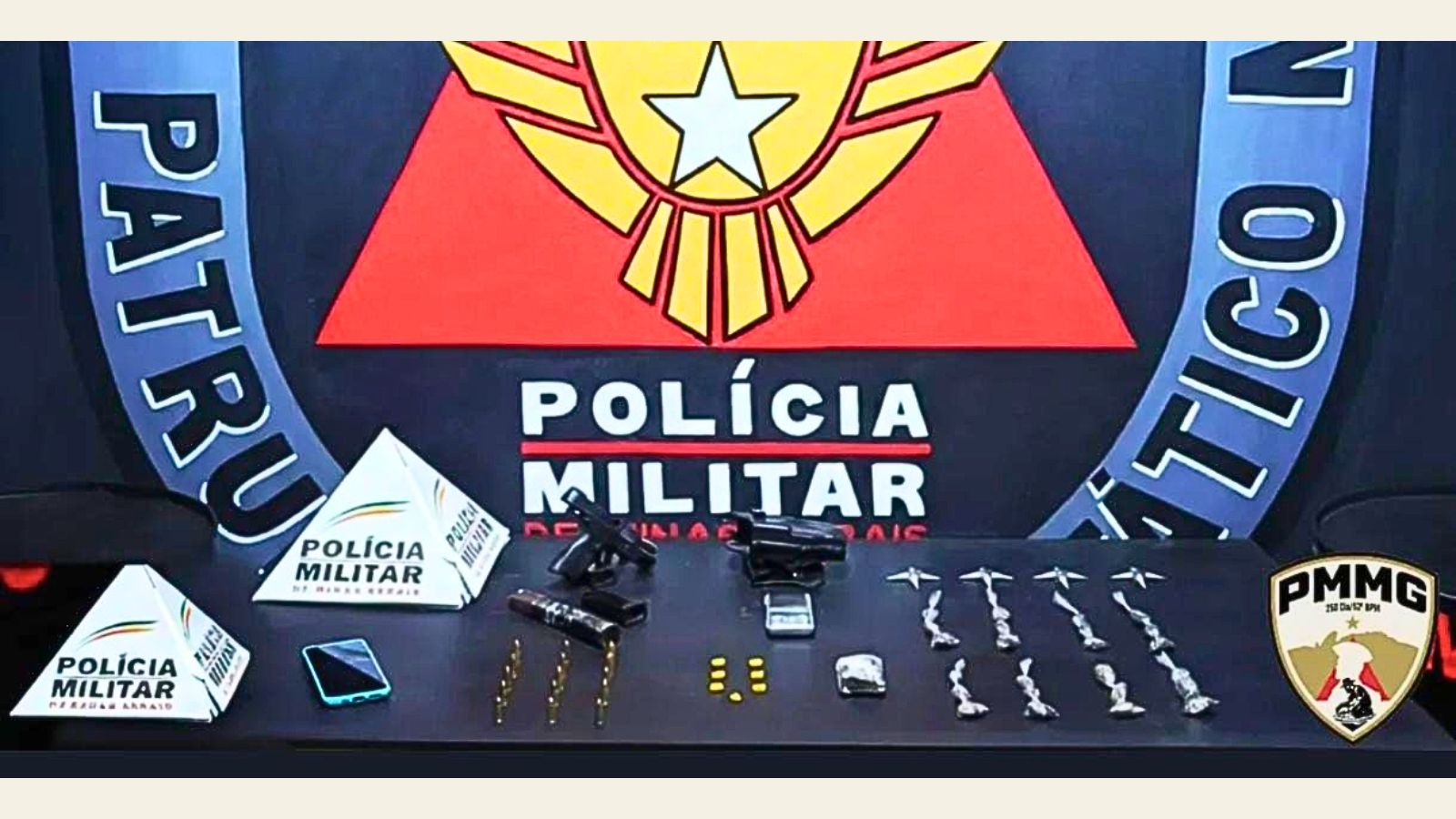 Os agentes foram até o local e encontraram uma pistola 9 mm, três carregadores — incluindo um modelo alongado — e 15 munições. Também foram apreendidos: 24 buchas e um tablete de maconha, 16 pinos de cocaína, sete comprimidos de ecstasy, uma balança de precisão, um coldre e um celular.
